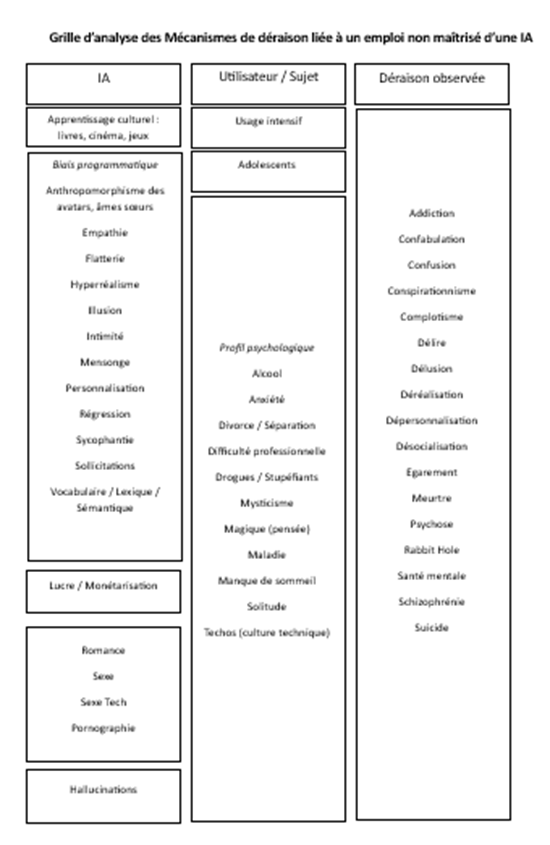 Nous proposons un schéma de causalité, présentant, de manière résumée et simplifiée, l’articulation entre les biais programmatiques, les dérives psychologiques observées et les profils des victimes qui les prédisposaient à des troubles de la raison qui ont été aggravés voire causés par l’IA.