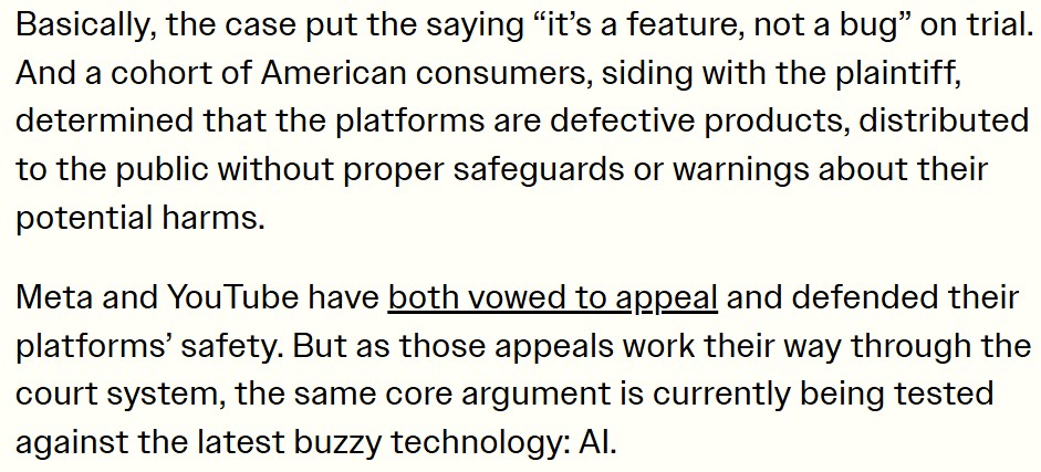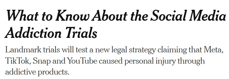 « Un jury a conclu que les entreprises avaient nui à une jeune utilisatrice en créant des fonctionnalités addictives qui ont entraîné des troubles de santé mentale » indique le NYT du 25/03/2026.