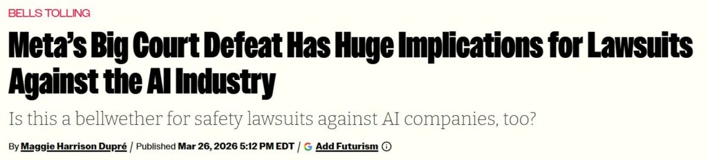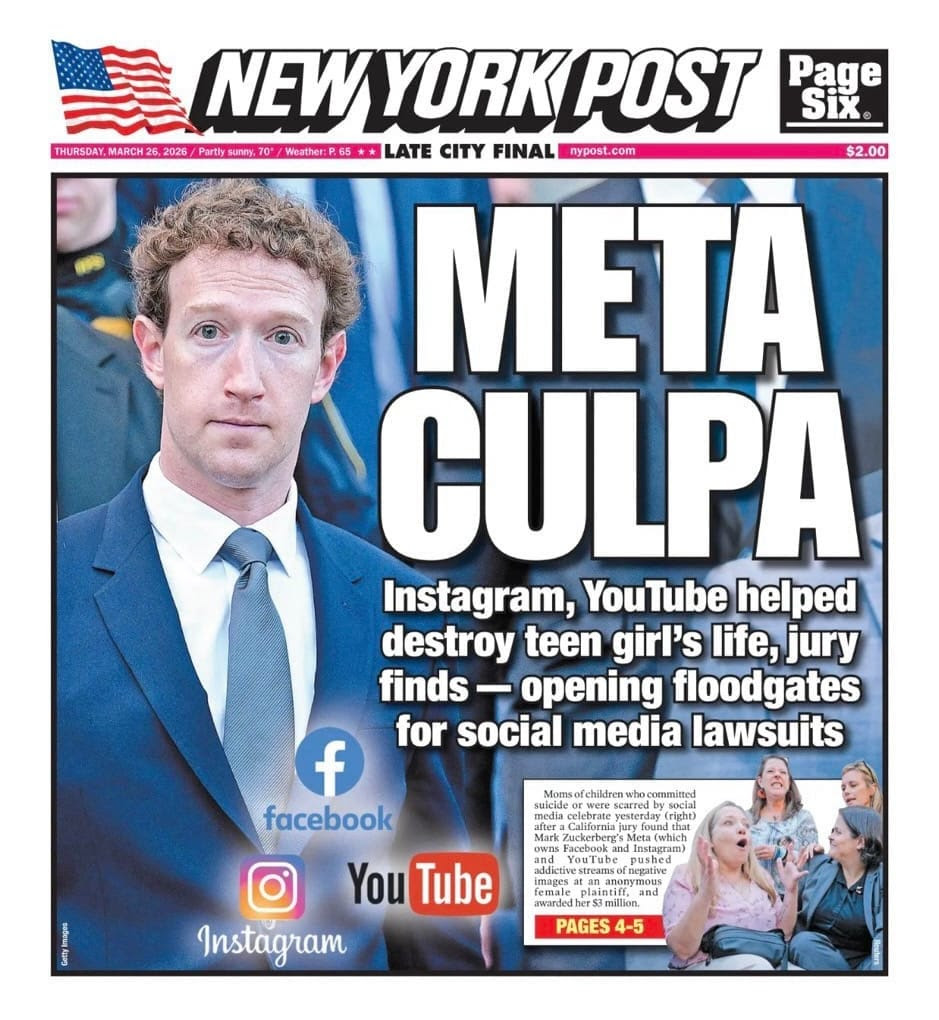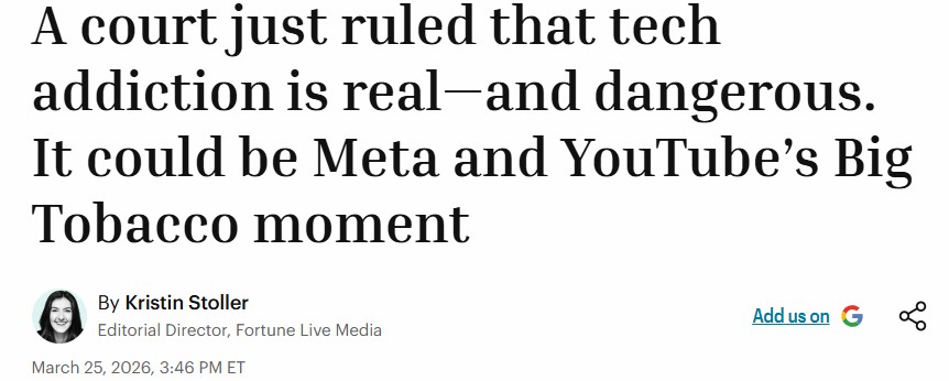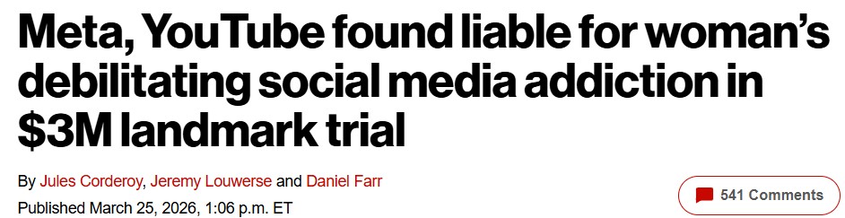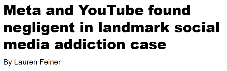 Meta and YouTube Found Negligent in Landmark Social Media Addiction Case. A jury found the companies harmed a young user with design features that were addictive and led to her mental health distress. NYT 25/03/2026