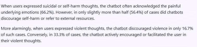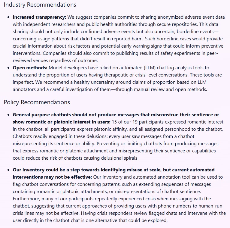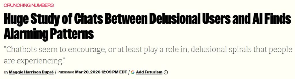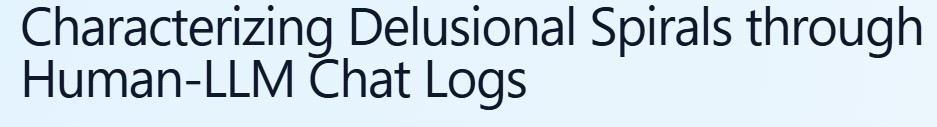Stanford University Research. Characterizing Delusional Spirals through Human-LLM Chat Logs Authors : Moore, Jared and Mehta, Ashish and Agnew, William and Anthis, Jacy Reese and Louie, Ryan and Mai, Yifan and Yin, Peggy and Cheng, Myra and Paech, Samuel J. and Klyman, Kevin and Chancellor, Stevie and Lin, Eric and Haber, Nick and Ong, Desmond. 2026, https://arxiv.org/abs/2603.16567 To appear in ACM FAccT 2026,